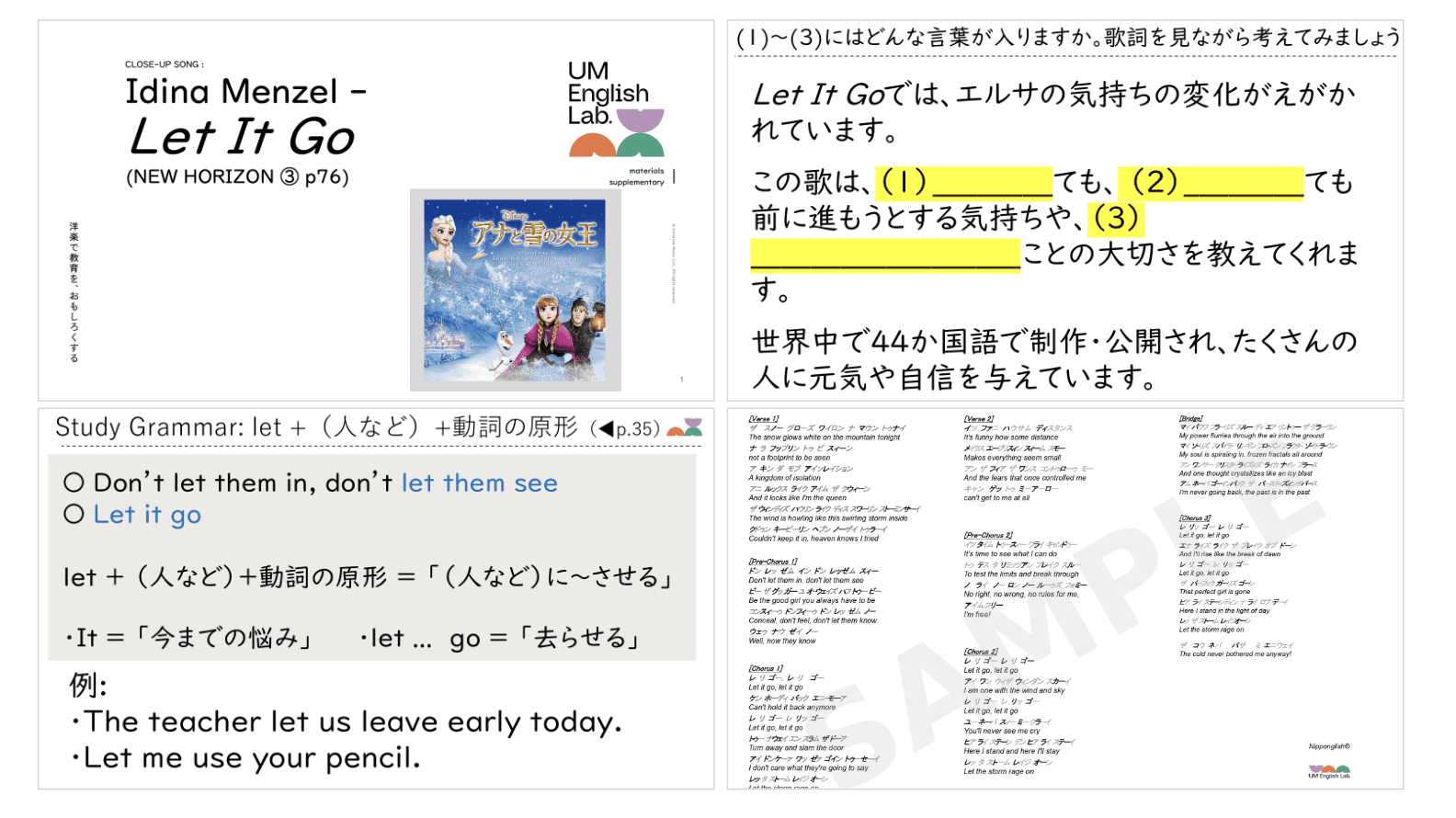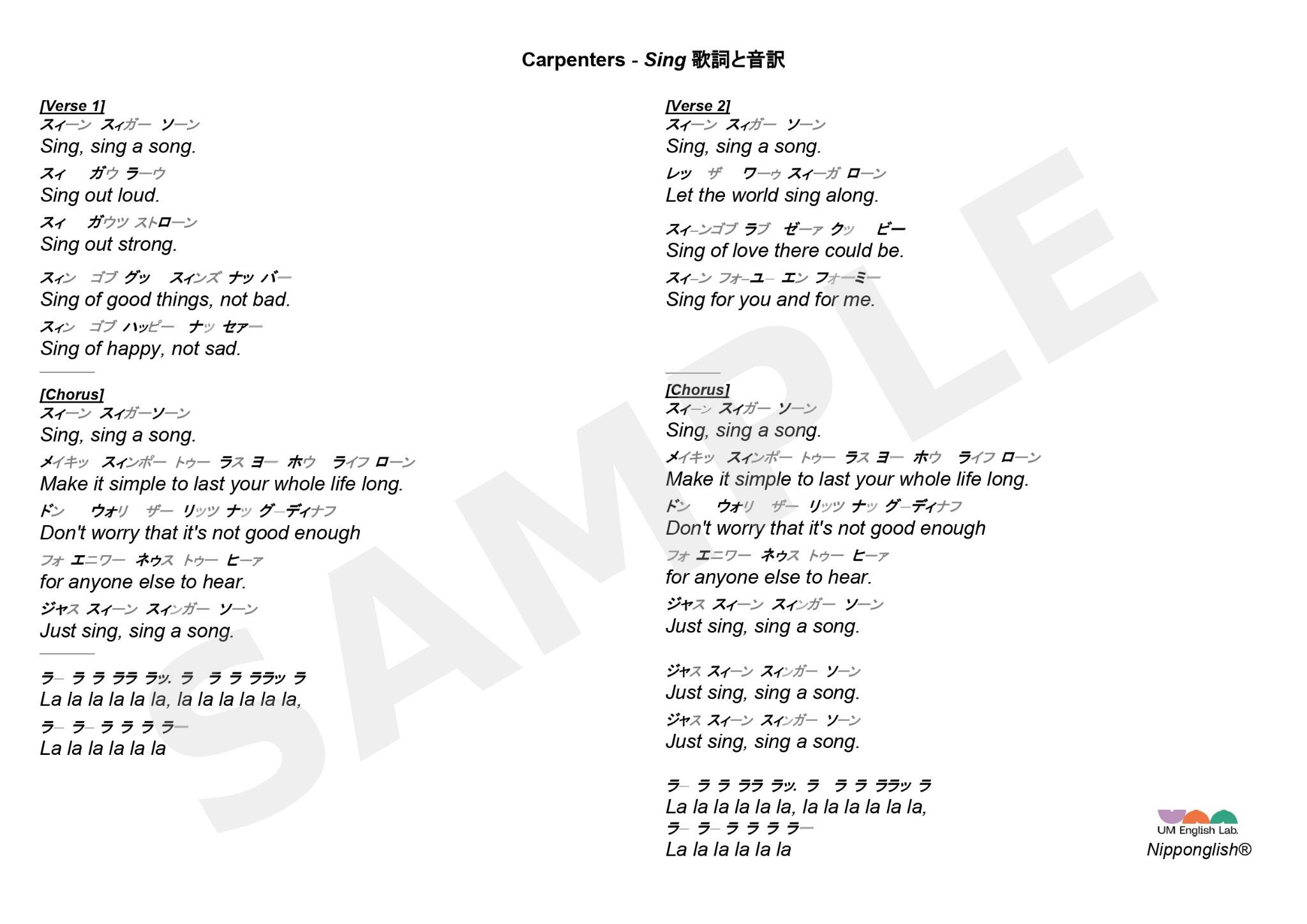 東洋大学の湯舟英一教授が開発した英語発音ツール「Nipponglish(ニッポングリッシュ)」による音訳を掲載しています。英語が苦手な生徒でも「英語で歌える!」という自信につながり、英語を楽しく感じられる内容です。