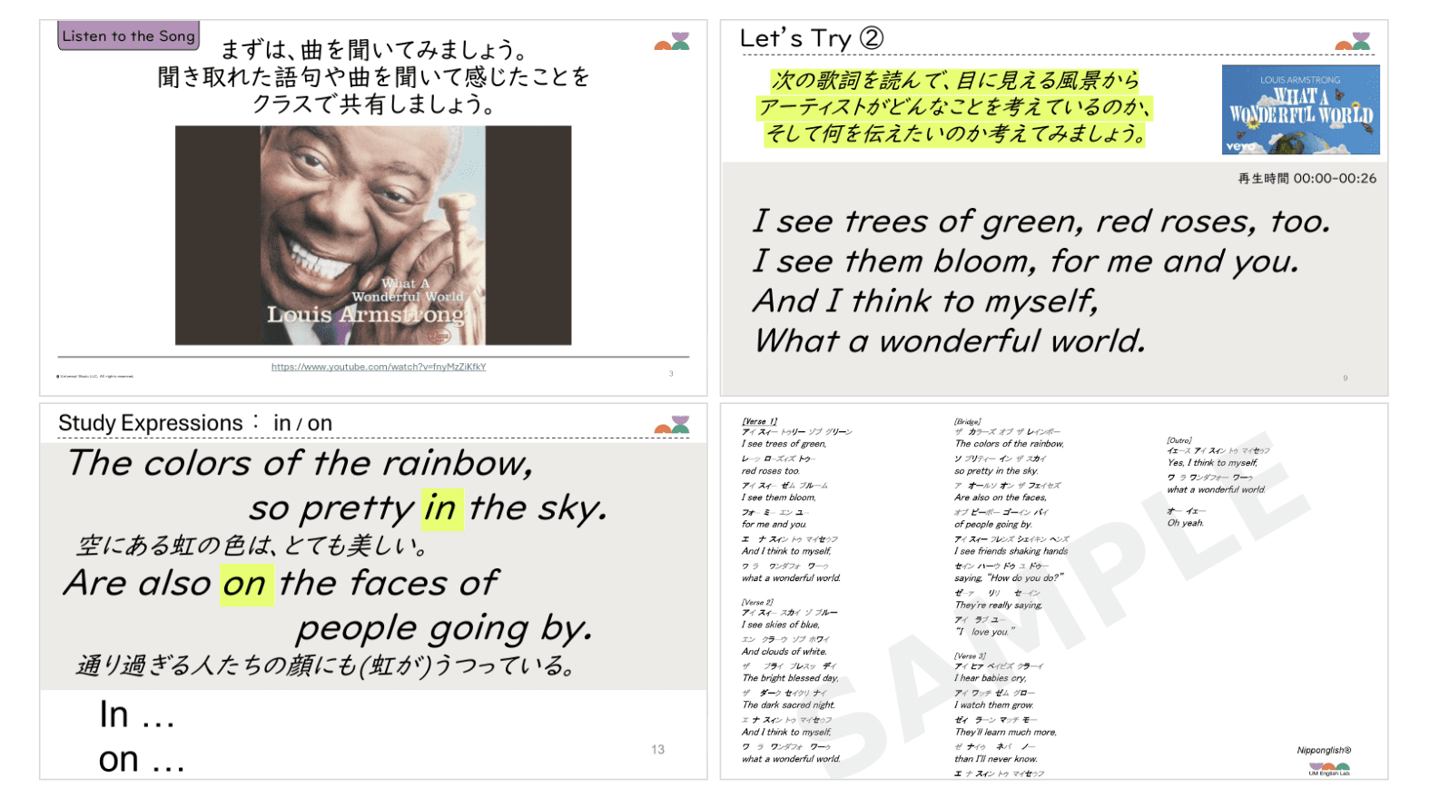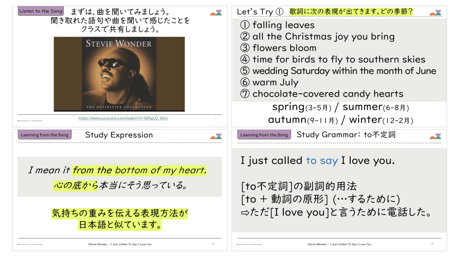 ① 教科書に掲載された楽曲を題材とした、英語と探究の教材スライド(PowerPoint形式)