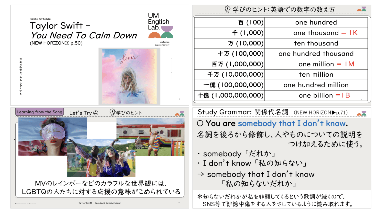 【内容】英語での数字の数え方/歌詞に登場する単語/関係代名詞/現在完了形/音訳 など